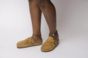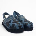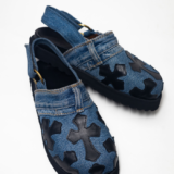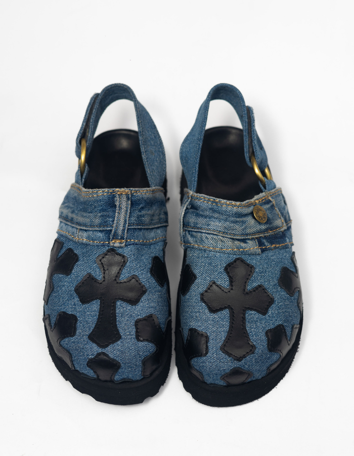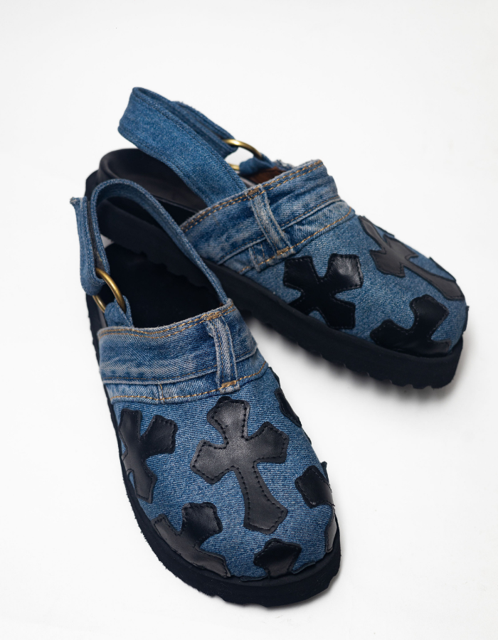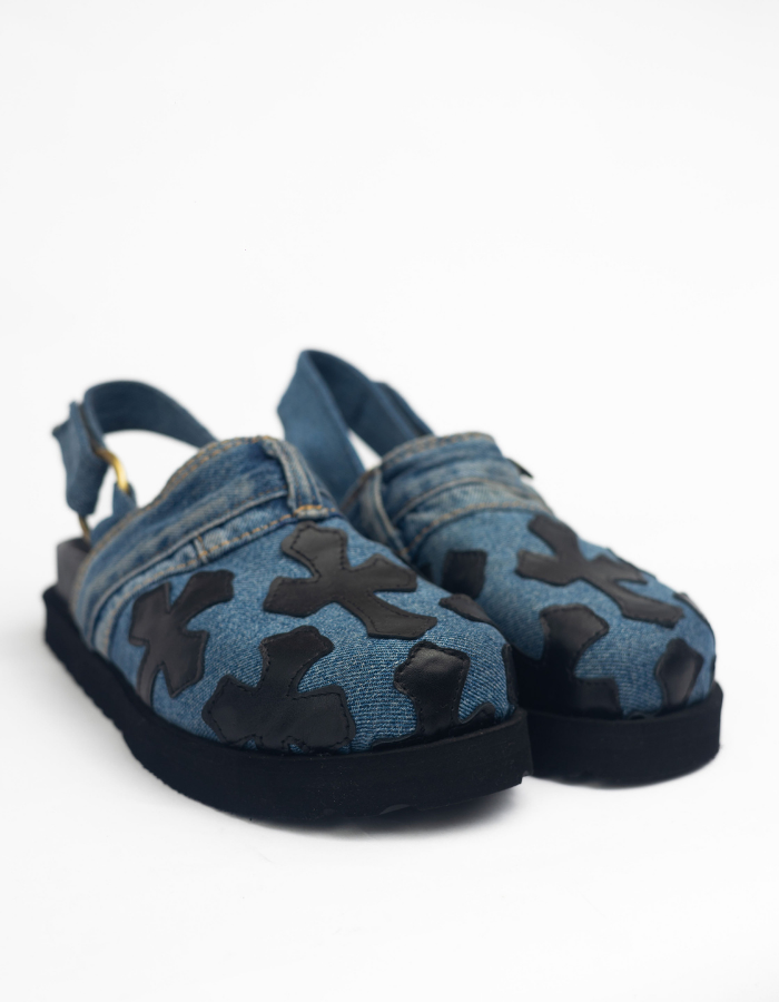 cork inner soles with leather fold and denim embossed chrome raven